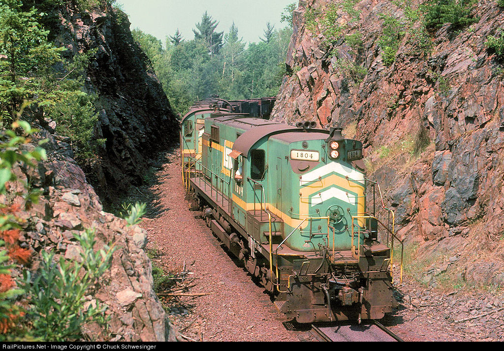 LS&I 1804,1852,1801 head for Tilden with 120 empties on a scorching July day. Power was dropping like flies on this day due to overheating, and probably may have caused LS&I management to rethink the policy of making do with the elderly roster of Alco's and GE's. The next spring/summer brought replacements in the form of Ex BN U30C's. LS&I 1804 was the last RSD-12 built by Alco.