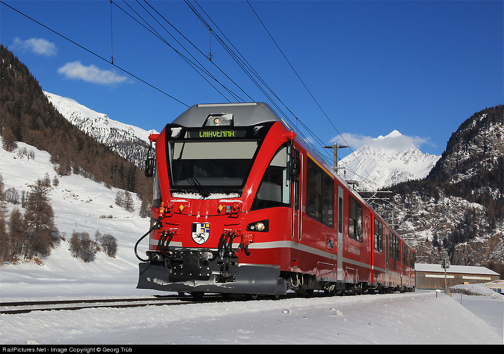 | New dual system trainset (EMU) ABe 8/12 3502 ALLEGRA on a driver training run from Scuol to Zernez. CHIAVENNA on the front destination panel is a joke, because this italian town has no connection with the RhB network and only standard gauge of Trenitalia. The beautiful white pyramid is 3410 metre high Piz Linard.