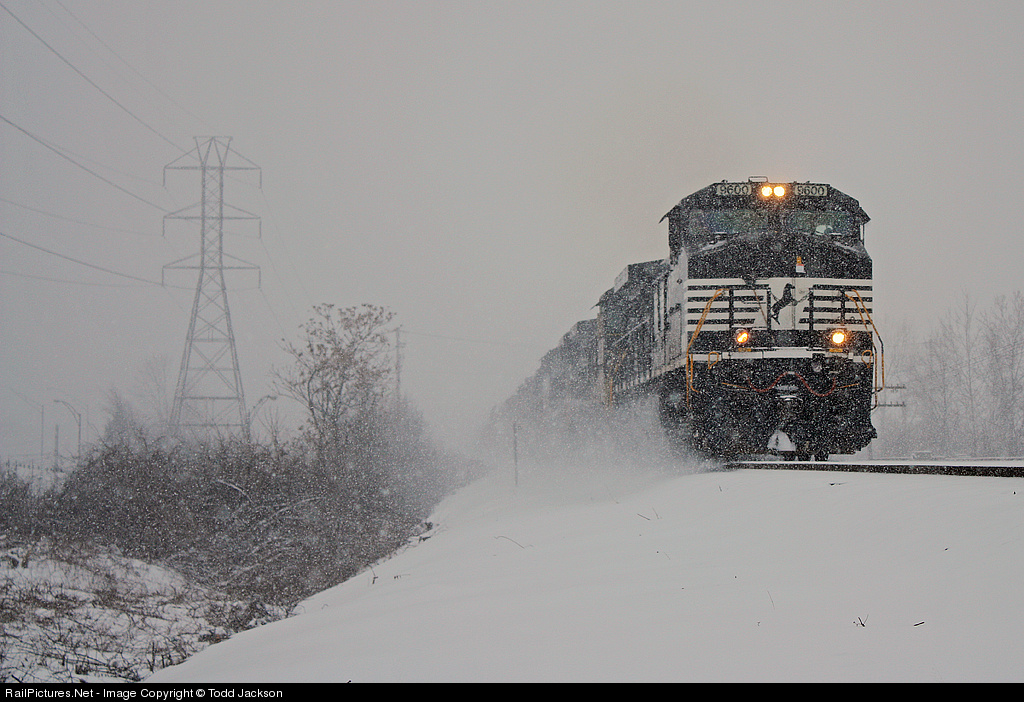 | Battling near white-out conditions, NS 9600 leads train 305 westbound on the Sandusky District toward its ultimate destination, Bellevue, OH |
