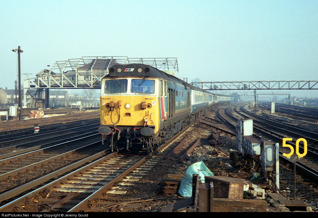 50034 'Furious' approaches Clapham Junction with the 11:10 Waterloo to Exeter St. David's service. 50034 was withdrawn in June 1990 and cut up at Old Oak Common in February 1991.