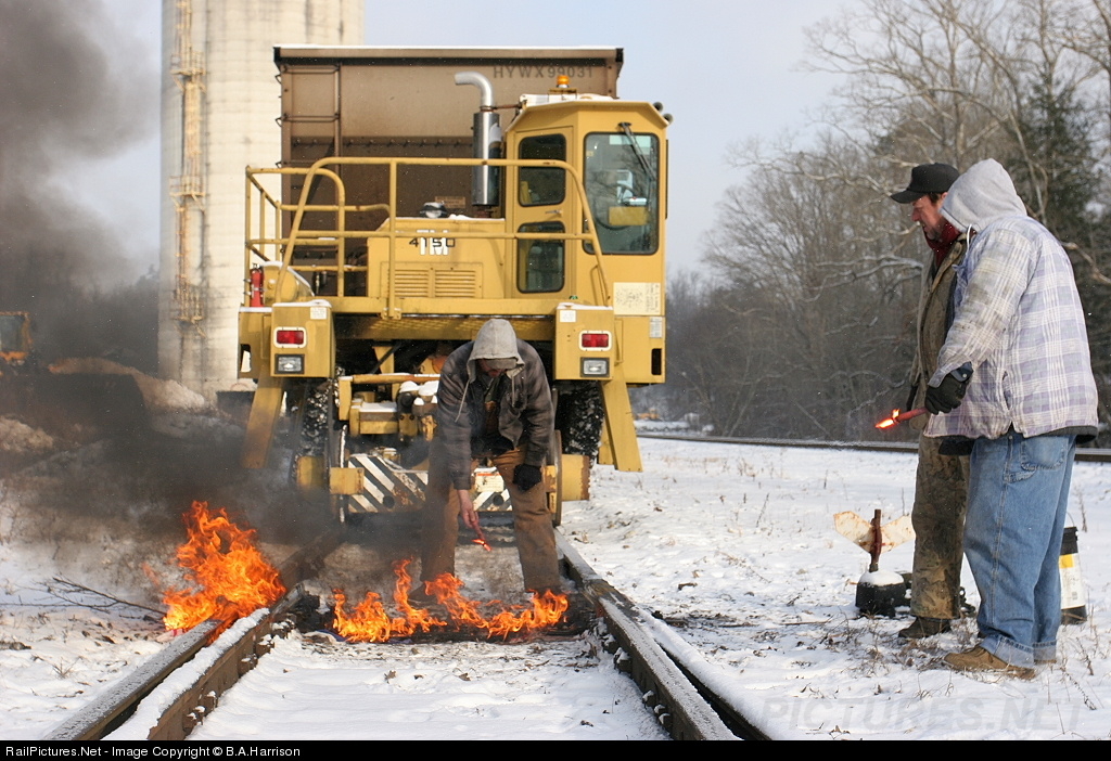 With a trackmobile and five coal hoppers behind, the crew uses plenty of diesel and fusees to unthaw a frozen switch in extremely cold temperatures.