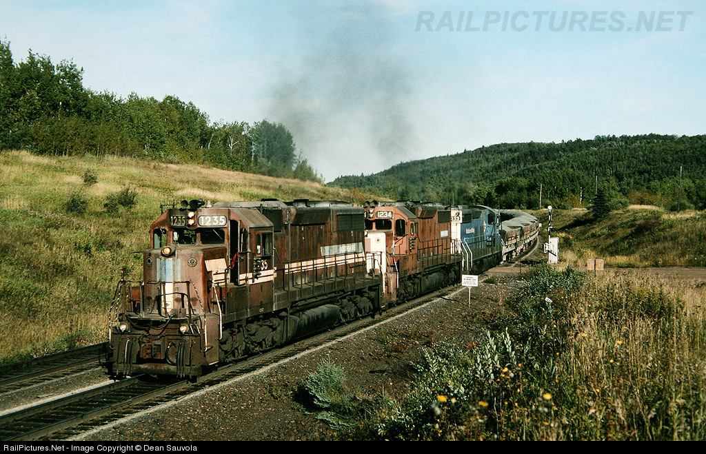 An SD28 leads a train of rock tailings up the hill away from Lake Superior to an inland dump site on the North Shore Mining Company Railroad. The paint on this unit is original to first owner, Reserve Mining, it also bears evidence of subsequent remarking for another interation, Cyprus Northshore.