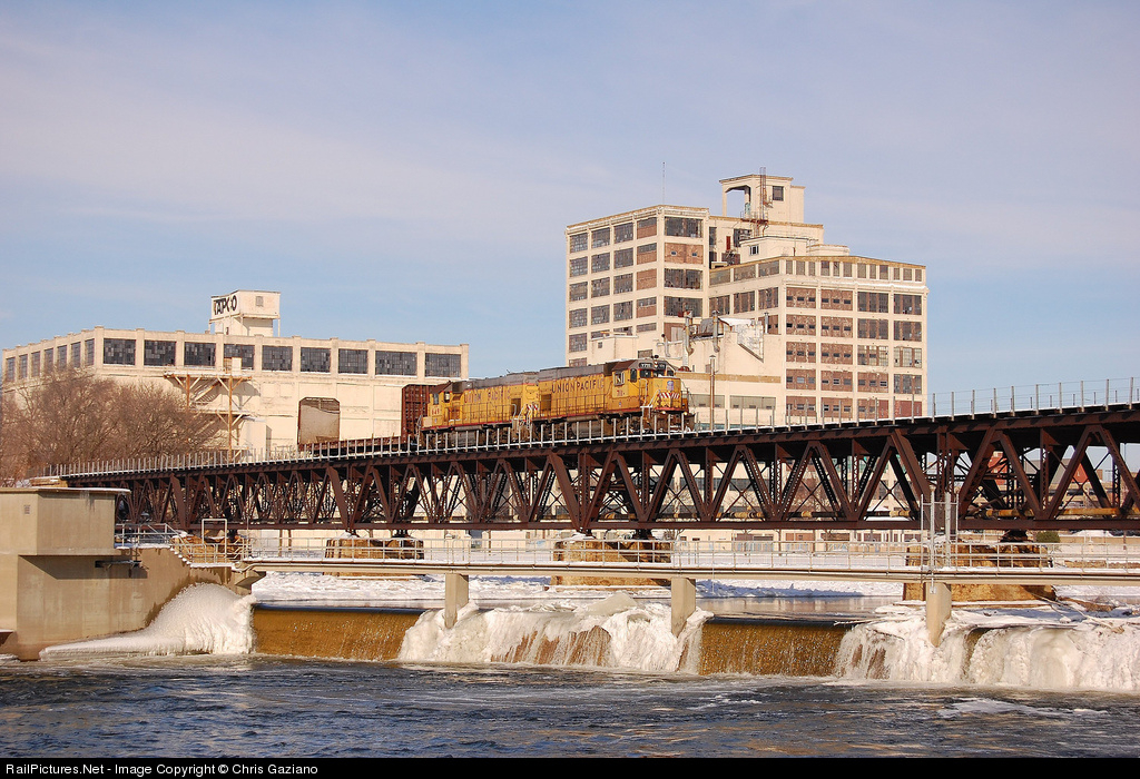 A Union Pacific local makes its way across the partially frozen Rock River with a lone empty flat car from a customer a little farther west down the line.