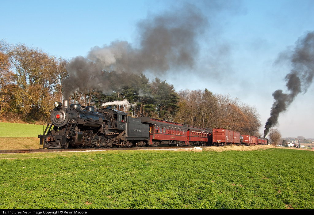 Steam powered trains pass at one of the most hallowed spots on any tourist railroad. The Strasburg Railroad recreates scenes that would have been commonplace 100 years ago, but are rare in the 21st century. In this one, Great Western Railway decapod #90 heads west toward Cherry Hill with nine wooden coaches in tow, while Norfolk & Western 12-wheeler #475 passes eastbound with a mixed train on a siding. There are but 4 places left in the US where steam trains pass each other with any regularity, and nowhere does it happen more often than in Cherry Hill, Pennsylvania.