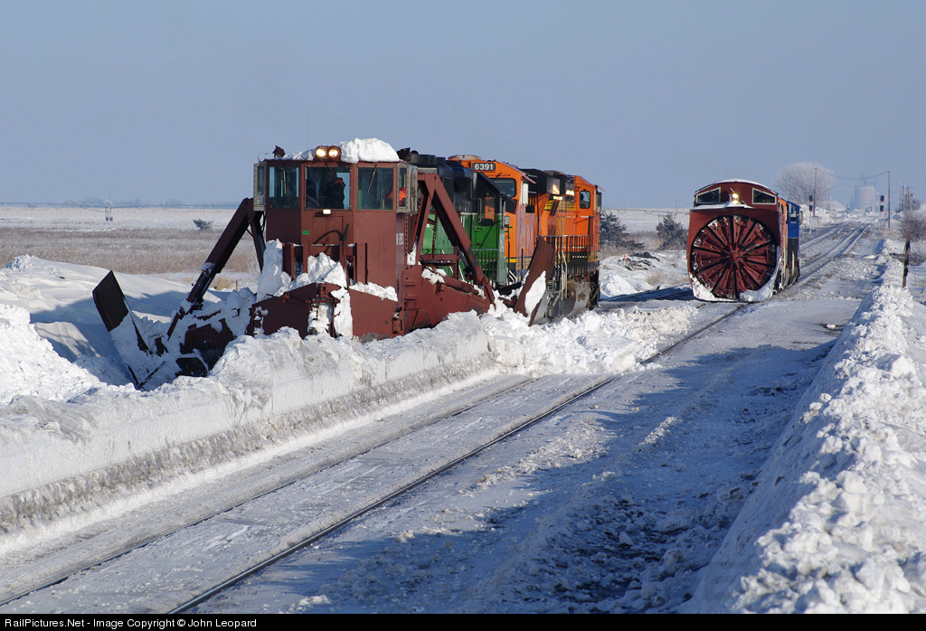 To remove the berm of snow between the double mains along the eastern end of the Ravenna Sub, BNSF utilized this Jordan ditcher to push the berm onto the other track where the rotary plow blew it off the right of way.