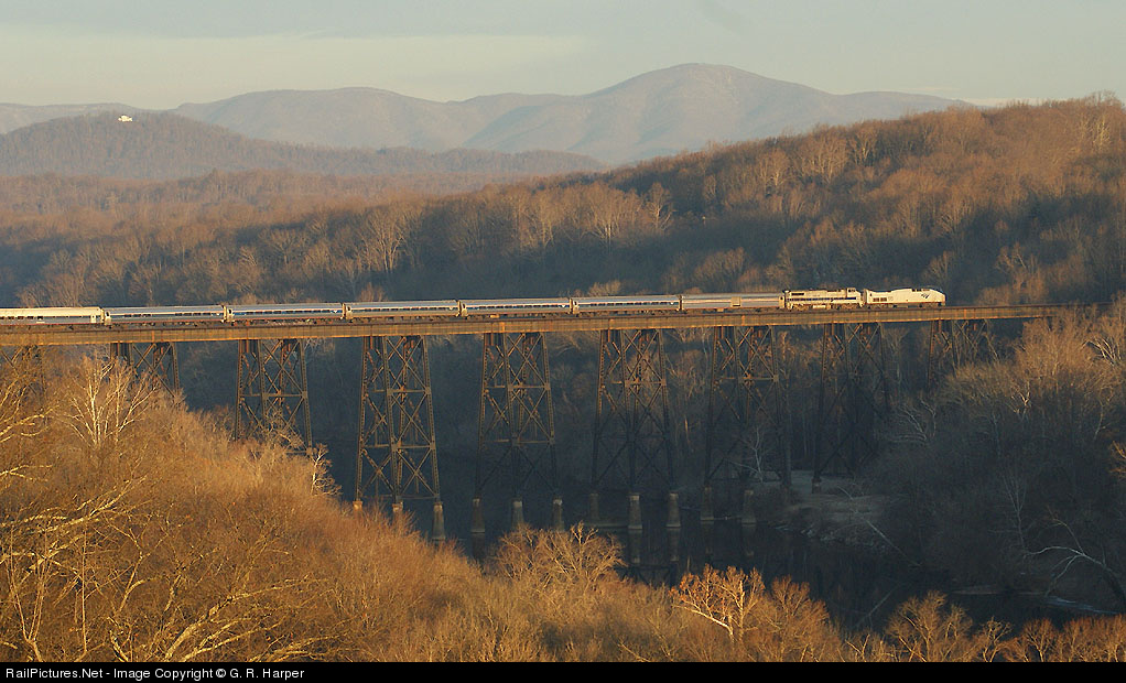 | A late Crescent, Train #20, crosses the James River leaving Lynchburg. "Pepsi can" #512 is trailing today. |