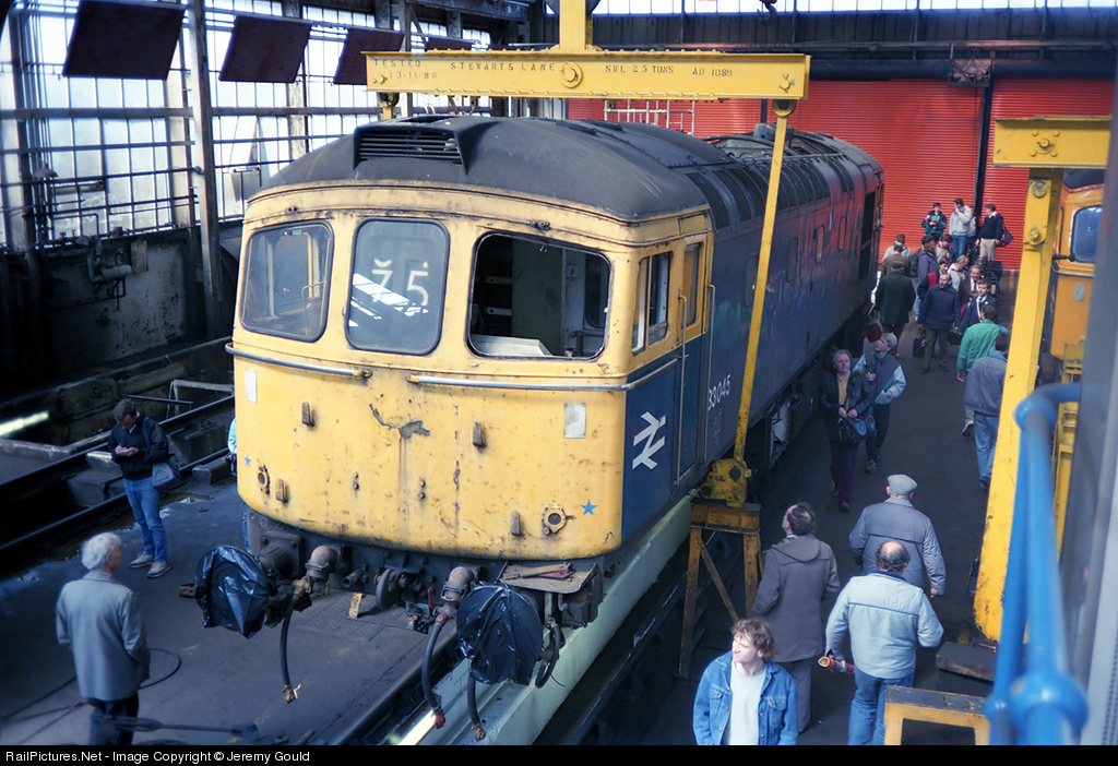 | A withdrawn 33045 gets one end lifted for bogie removal at the Stewarts Lane open day in 1988. This locomotive was withdrawn in October the previous year and would meet its end at Vic Berry's in October 1990. |