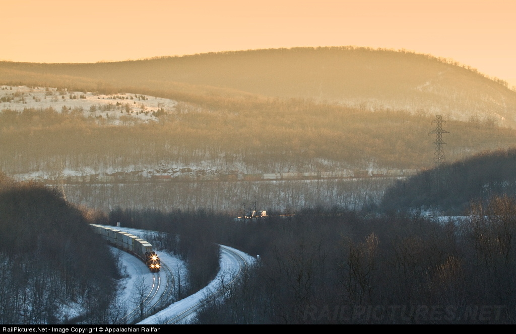 This westbound double stacker is about to crest the grade at Gallitzin as the early morning sun rises above the Allegheny Mountains. Photo taken with Canon 7D.