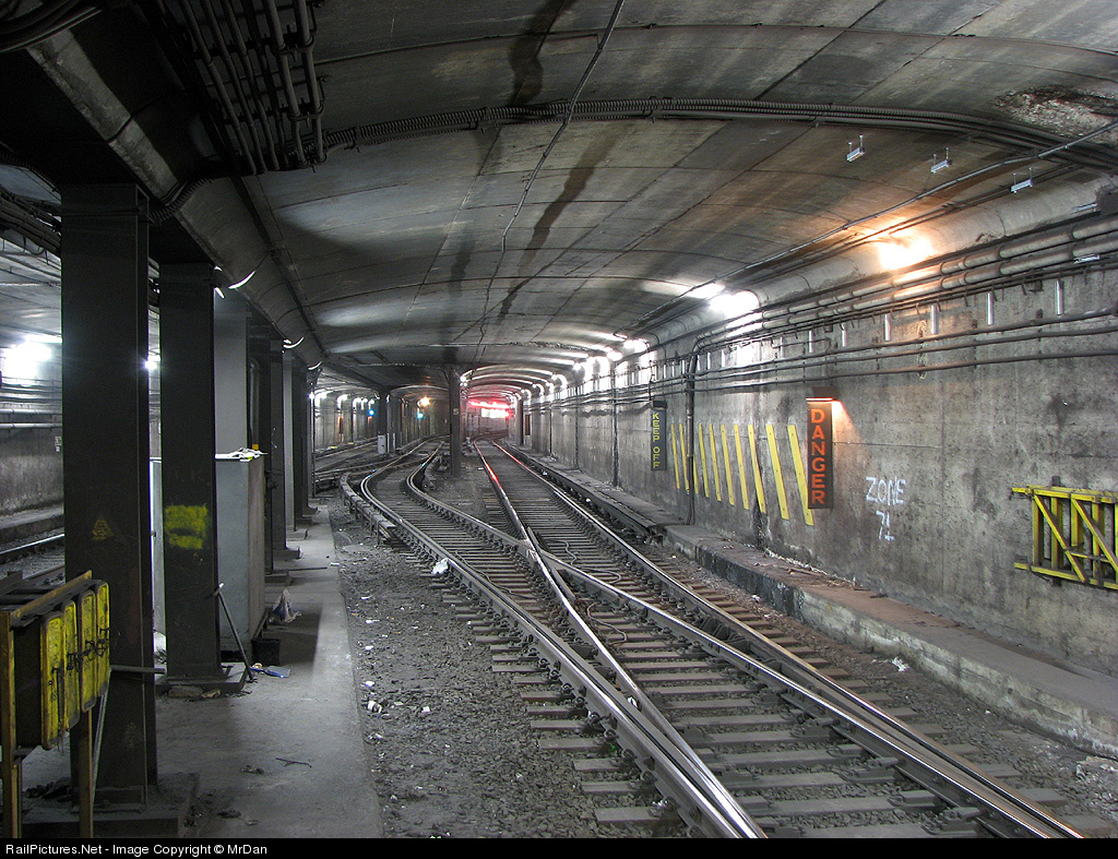 | A look into the dark, dirty and gritty tunnels that are part of Toronto's underground transportation network. The northbound and southbound University line tracks are pictured on either side of the pocket track used for parking and turning trains. Taken from the end of the platform of Union Station, where thousands of commuters travel through daily. |