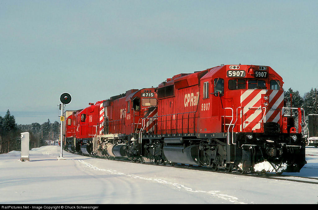 Everyone who has ever railfanned has had one of those adventures where You sometimes have to question the sanity of the "sport". Here is the setting for one of my big ideas, daylight train action around my home in Trout Lake, MI has dwindled to the point that one may see 3 or 4 movements a month in winter time. WC stubbornly seems to run everything under cover of darkness. How about we take a "one" day trip to the CP mainline in Cartier, Ont. Departure from Trout Lake is 3AM, arrival at Cartier 8:30AM just as day is breaking. Lots of smoke from chimneys and vehicles confirm its cold, real cold. My wife and I check in with Jim at the station. There is a line-up full of trains, all of which are having problems due to the extreme cold. Oh did I mention it was -34F on our arrival! To make a long story a little shorter we only managed to bag two trains in the daylight. In this photo by Sonya we have #482 coasting into the station for a real quick crew change. Note the frost on the fuel tanks of these units. Power is 5907,4715,5535,4723 leading 62 cars. A couple of hours later we were able to get a #404 and then were faced with the long drive home. Was it worth it, at the time we figured no, but looking at these shots nearly 20 years later we would have to answer with a resounding YES.