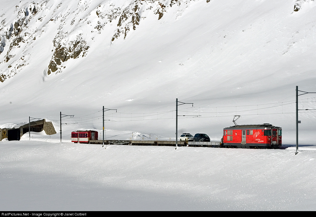 Autozug approaching the summit of the MGB at Oberalppass, this loco was part of the BVZ fleet before it's merger with the FO to form the MGB.