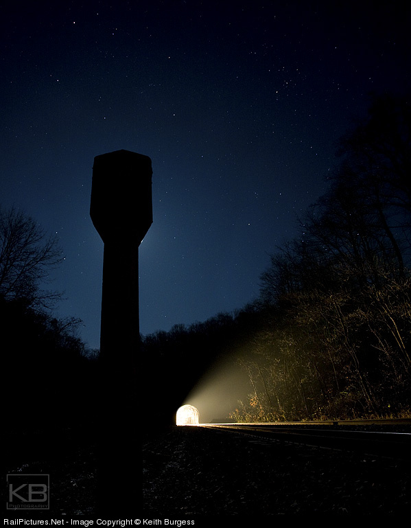 A B&O whistle post blocks the moon as the headlights from an approaching train illuminates Kingwood tunnel.