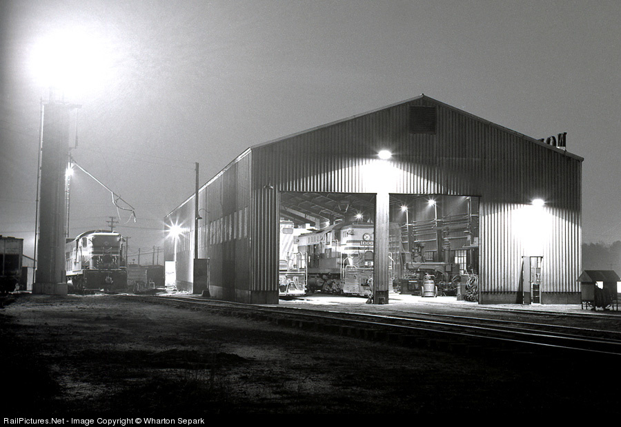 We are standing outside the shop at "Original" Norfolk Southern's Glenwood Yard in Raleigh, NC. A GP18 and an AS-416 are inside for the overnight while a lone AS-416 idles on the sand track awaiting the midnight yard crew.