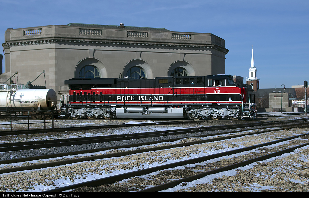 | Over the years fans have shot this classic pose of Rock Island trains crossing the Santa Fe and GM&O diamonds at Joliet. 30 years after the Rock ceased operations IAIS 513 fondly brings back the many memories of a classic railroad with its classic paint schemes passing by the depot. Today it's BNSF and UP that the IAIS crosses on Metra trackage rights. |