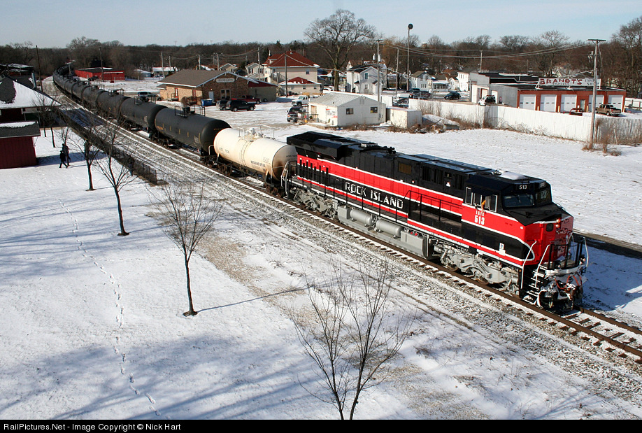 | Iowa Interstate's Rock Island heritage unit, #513, leads an extra ethanol east, through Morris, on its way to Blue Island. |