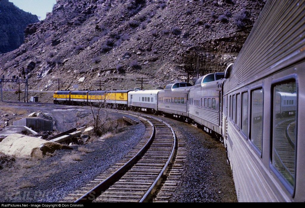 Vestibule riding was always fun and accepted on the Rio Grande Zephyr. Rio Grande #18's headend is eastbound, downgrade west of Helper, UT, near Castle Gate, as seen from the vestibule of dome-observation Silver Sky. These were the days when five car trains were normal, before it became a standard gauge "Silverton Train."