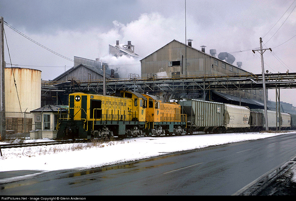 FP&E Alco S2s 103 & 102 roll westbound with a mix of NYC and PC covered hoppers past the Diamond Shamrock plant, the shortline's primary customer at the time. The Diamond plant is long gone, but the railroad was merged into the N&W, now NS' Fairport Industrial Track running from a connection with the ex-NKP mainline at Perry, OH.