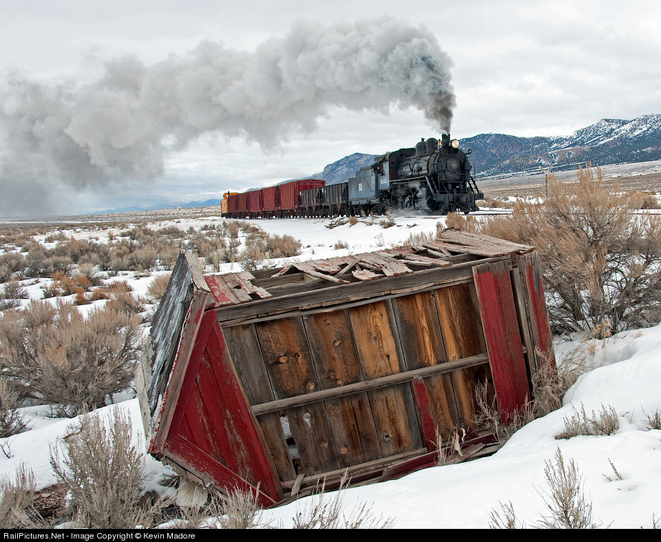 From this toppled switchman's shack at Hiline Junction to the Nevada Northern's terminus at Cobre is a distance of just over 135 miles. Over that expanse, the scenery doesn't change a whole lot. The mountains of the Egan and Cherry Creek ranges tower to the west, while the Schell Creek range dominates to the east. In between, there is nothing but a seemingly endless high desert plain called the Steptoe Valley. Here, a Nevada Northern hopper train has just 4 miles to go in its southbound journey toward the yards at East Ely.