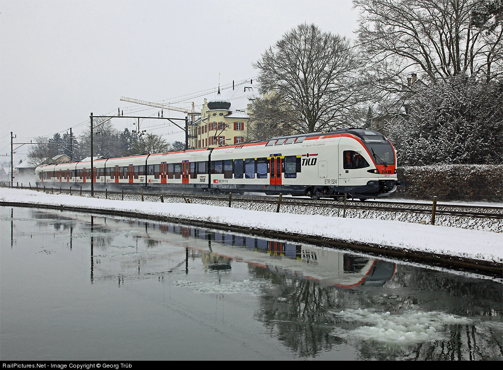 | Brandnew sixcar trainset FLIRT from StadlerRail on a test run from Bussnang to Sulgen. The dual system train (3000 V DC/15000 V 16,7 Hz AC) is for the daugther company TILO (Treni Regionali Ticino Lombardia), a joint venture of SBB and Trenitalia for regional traffic. |