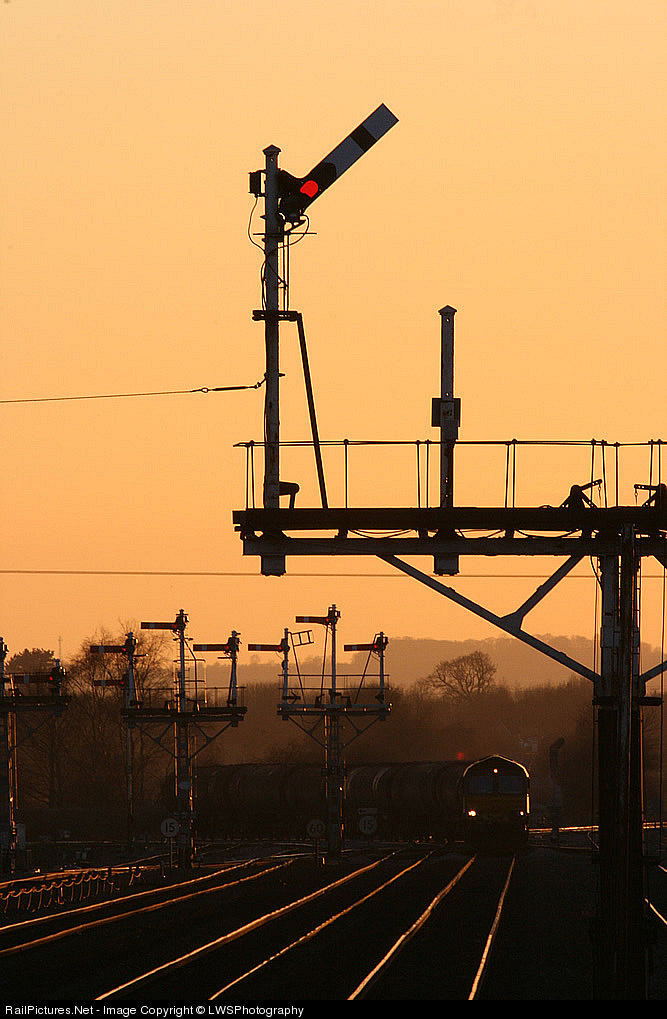 | As the sun sets across Lincolnshire, this EWS 66 passes through Barnetby with the Lindsay oil tanks, one of the few places left in the uk with mainline semaphores still in use. |
