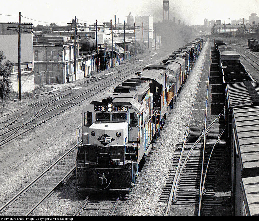 | Ex RDG GP-35 leads a mix of light power. 2nd unit is a CNW U-30-C, followed by a pair of F-units. That's the Kodak headquarters building sticking up to the left of the water tower. |