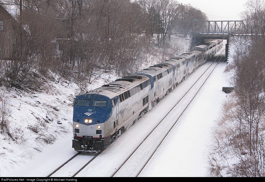 | On this day the Capitol Limited was 2:23 down arriving at Toledo at 7:36 AM in the morning. After a 9 minute station stop they're heading west with no less than four units up front as they approach the 289 signals at the east end of NS Toledo yard. |