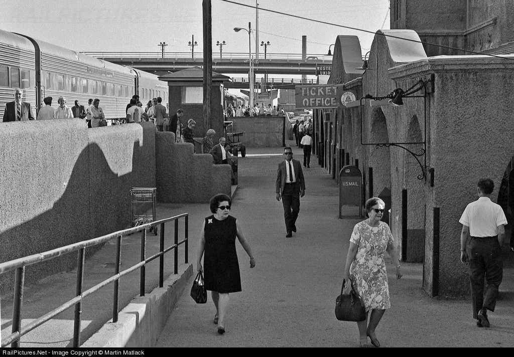 Train travel, 1969. The westbound ATSF Super Chief/El Capitan is in the station for a service stop and crew change; the passengers have 30 minutes to stretch their legs. The dress was a bit more formal in those days. The ticket office and hotel are long gone.