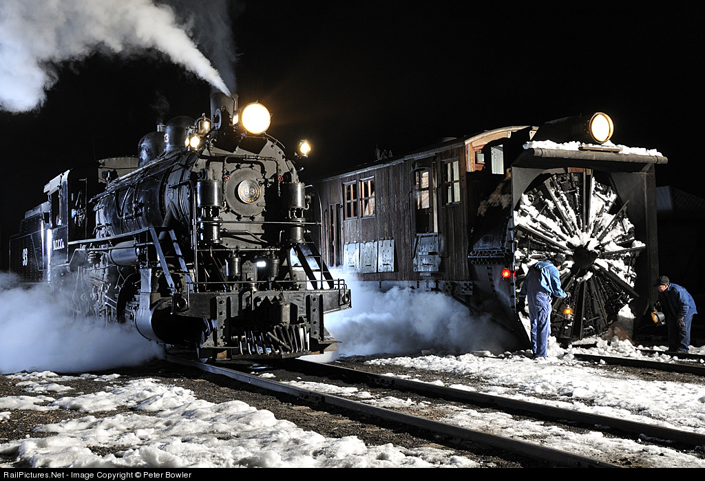 Nevada Northern 2-8-0 # 93 steams up adjacent NN's rotary snowplow as crew inspect the plow on a cold Febraruy evening.