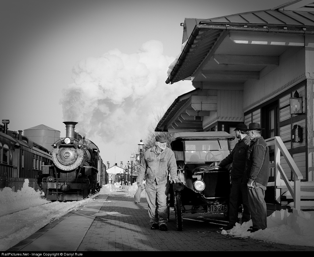 | As the Virginia Creeper arrives at the station, 3 local gentlemen discuss the recent back-to-back blizzards, paying no attention to 382 and her short freight train. |