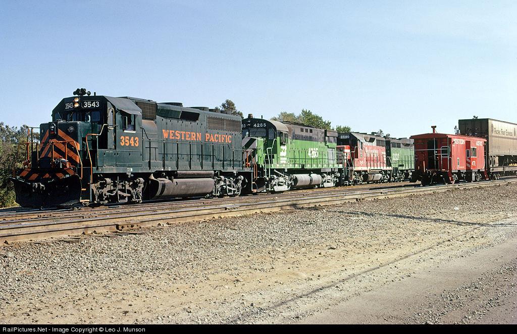 Western Pacific GP40 3543 leads a consist that is made up of Burlington Northern pool power, including C-425 4265, GP35 2540 and GP30 2222. It was a colorful time to be in northern California!
