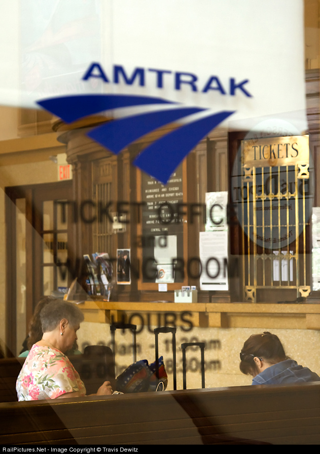 Passengers wait patiently for Amtrak #8 in La Crosse, WI. Through the window you can see the old half moon ticket counter.