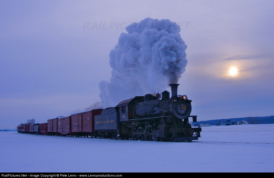 | On a freezing February morning, N&W 382 marches through record high snow during a Lerro Productions photo charter. |