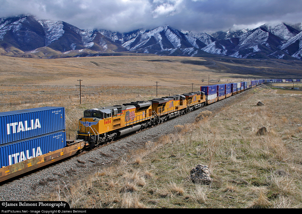 In March of 2007, the Union Pacific ran an 'Overland Route Super Stack Train' west between Global One in Chicago and the Port of Los Angeles. Pictured on the Lynndyl Subdivision some 25 miles west of Salt Lake City, a DPU helper pushes and pulls the 186 load and 12,322 ton train west up the Erda hill grade. The KG1LAE-08 was set up at Global One and was 12,703 feet in length. In the background of this spectacular vantage point is Utah's Oquirrh Mountains and on the opposite side of these rugged peaks is the Salt Lake Valley.