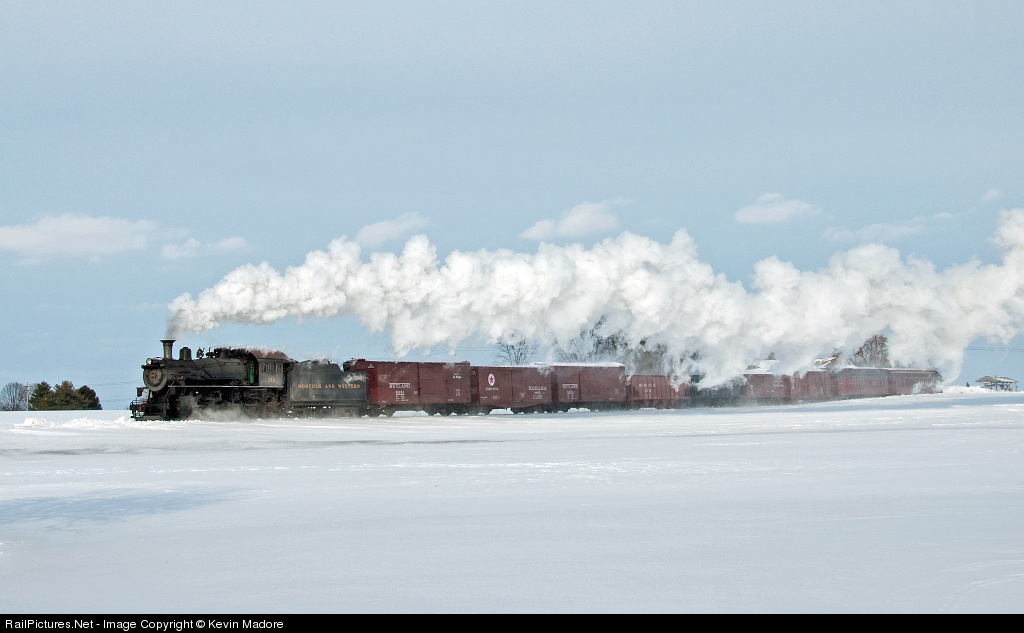 Engineer Joe McNew extracts as much speed as he can from his 50-year-old Mollie #382 in an effort to keep the Virginia Creeper on schedule. It's a freezing cold February afternoon and he and fireman D.S. Nichols have their deckless cab buttoned up as tightly as possible. At the back of the consist, the few folks riding in the coach and combine are all clustered around the coal stoves, for there's no steam heat on this run. It may be 1956, but on board Train 201, the technology hasn't budged since about 1910.