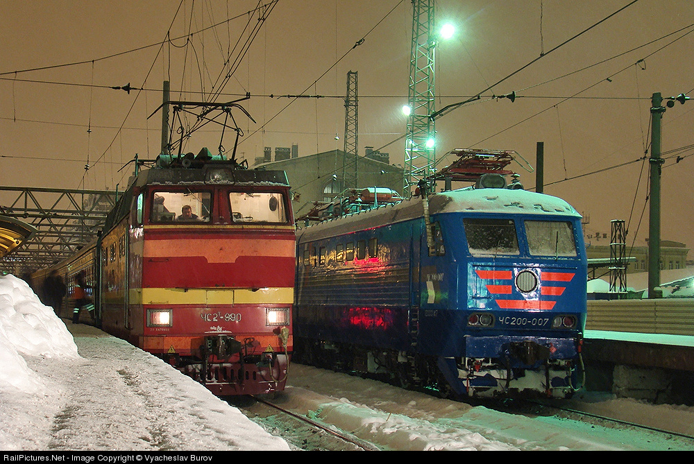 CHS2T-990 and CHS200-007 electric locomotives at Moskovskiy (Saint-Petersburg-Glavniy) station