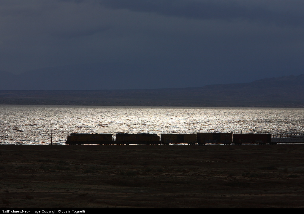 A heavy storm rolls in off the Santa Rosa mountains as an eastbound manifest races along the choppy waters of the Salton Sea at Betram.