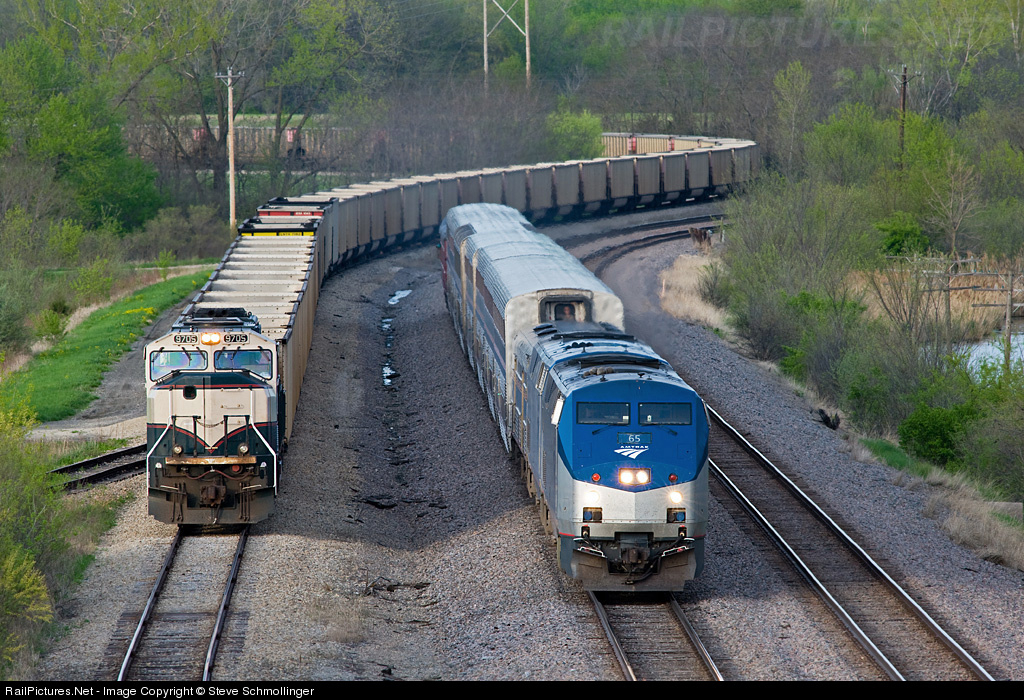 | At sunset, Amtrak train No. passes ISU switch where a coal train has been recently unloaded at a nearby power plant. |