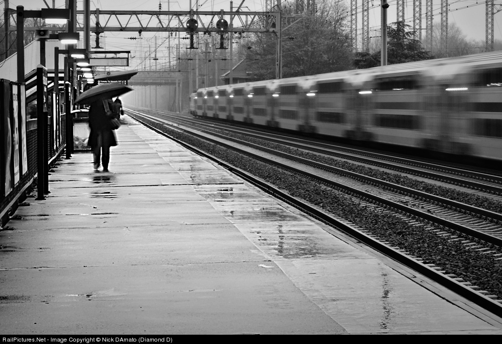 A lone passenger walks down the rainy platform as an eastbound eases away toward NYC