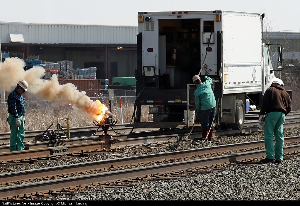 A maintenance worker just lit off the pot to initiate a weld on track 2 of the Chicago Mainline.