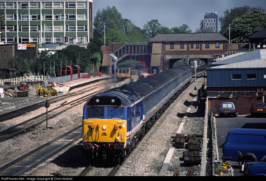 Nearly twenty years ago, before the stringing of overhead wires at this once popular photographic location, 50035 Ark Royal, in fresh Network SouthEast livery, thunders through West Ealing on an early afternoon Paddington to Oxford service in May 1990. All the rollingstock in this image has been consigned to history, although 50035 survives in preservation.