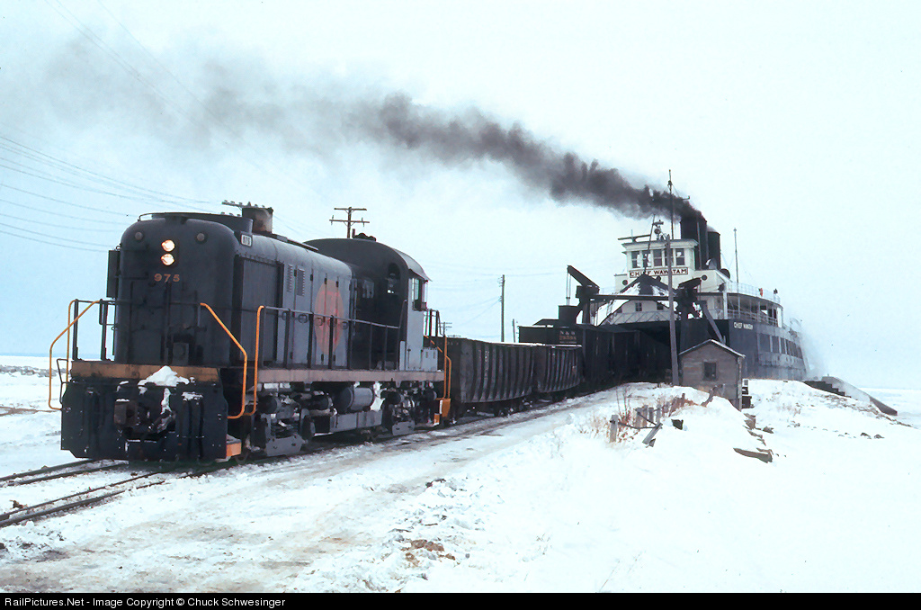 On a frigid Feb. day D&M 975 is trying to get some loaded coal hoppers onto the Chief Wawatam at Mackinaw City. The coal was bound from West Virginia to Algoma Steel at Sault Ste. Marie and was part of a 300 car move that was hauled up on the Michigan Northern. It was the Chiefs largest amount of freight in a number of years. The Chief has a good head of steam built up and will soon be doing battle with the ice clogged Straits of Mackinac.