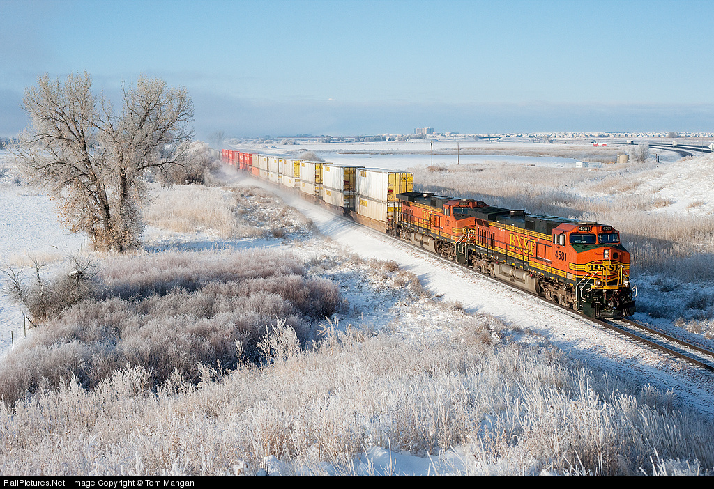 | A Spring snowstorm has covered the area around Denver with fresh snow. Here we see BNSF's hot Z trains the DENCHI blasting past the frozen landscape of Tonville, CO on BNSF's Brush Subdivision. The Z train should have no problem navigating Colorado's high plains as today its only a short 124 axle train. |