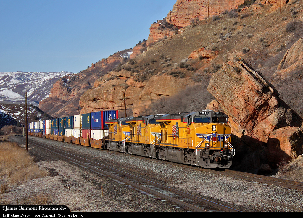 | A clean trio of UP ES44AC units lead a Lathrop, CA to Global 1 (Chicago), IL stack train through Echo Canyon at Hanging Rock. |