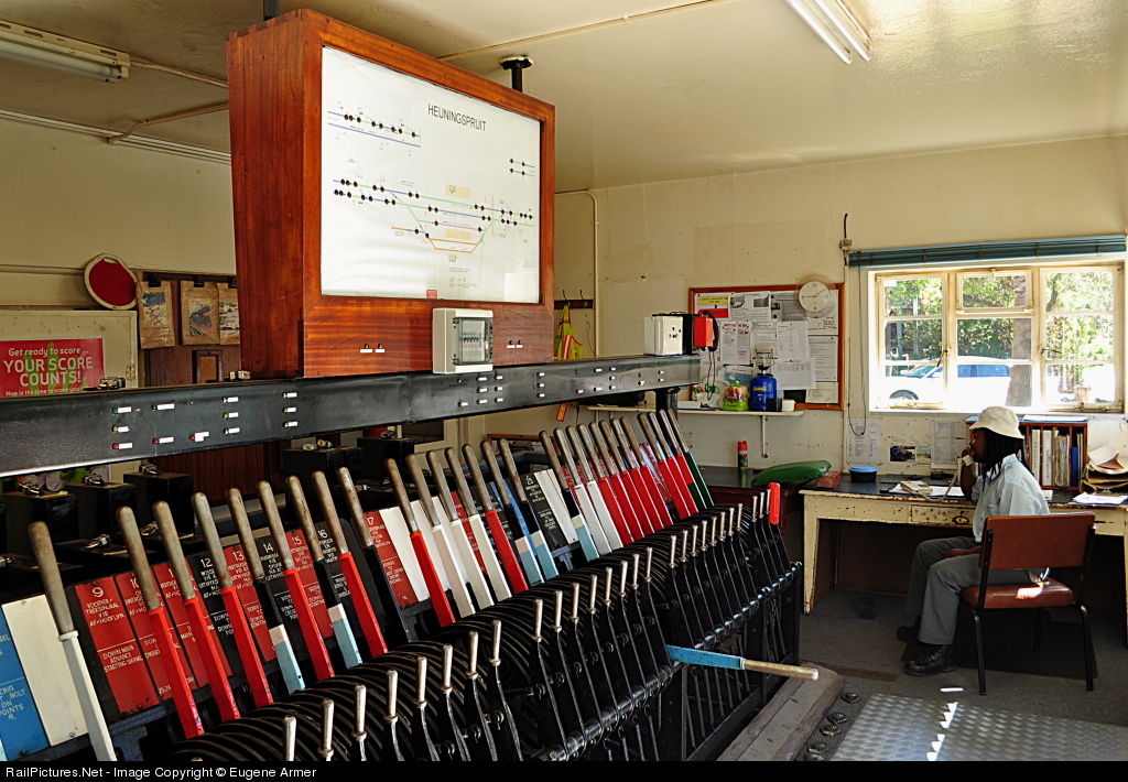 The Train Control Officer (TCO) at Heuningspruit makes a telephone call to his colleague at the next station. The track diagram above the lever frame has been recently updated, since the main platform loop was removed. The white box just below the track diagram is a circuit box installed in 2009 when the points (switches) were electrified. The semaphore signals are still controlled by the levers, but the question is, for how much longer?
