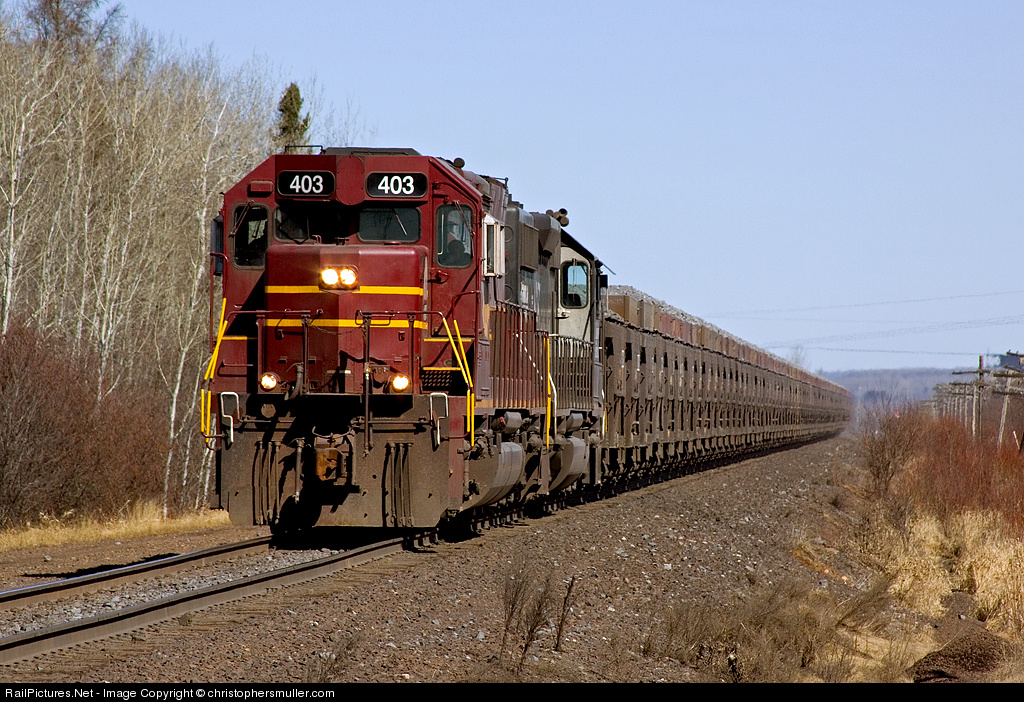 | One of two remaining Maroon and Gold DMIR locomotives leads a raw taconite train enroute to Unitac where it will be processed into taconite pellets. For some reason the train went into emergency as it passed by. |