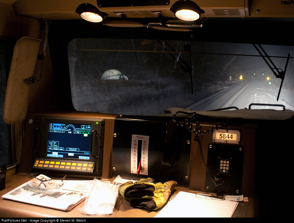 BNSF 5844's conductors desk lit up on a cold and snowy Winter night.