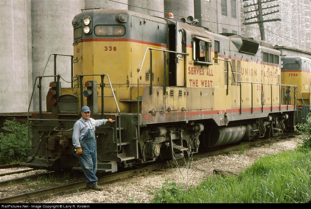 | While waiting on a westbound to depart Short Line Yard, the head brakeman of an eastbound R.I. freight with all U.P. power kindly posed for me in front of his borrowed 1957-vintage GP9 #338. The other power this day in 1975 was a GP9B and an SD24B. This train was holding out at the E.18th street crossing, just west of Short Line Tower. Taken on Kodachrome 64 with 55mm Minolta lens. |