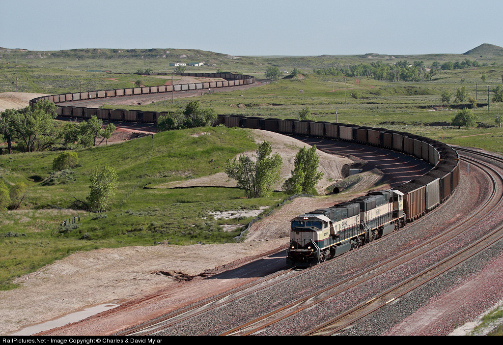 Winding its way through multiple S-curves, the 63rd load from Black Thunder Mine to Alabama Power’s James H. Miller, Jr. Electric Generating Plant at Palos, Al, drops down White Tail Hill at the north end of the Orin Subdivision. The train is powered by four SD70MACs, 9694 and 9530 on the point and 9955 and 8957 as the rear DPU.