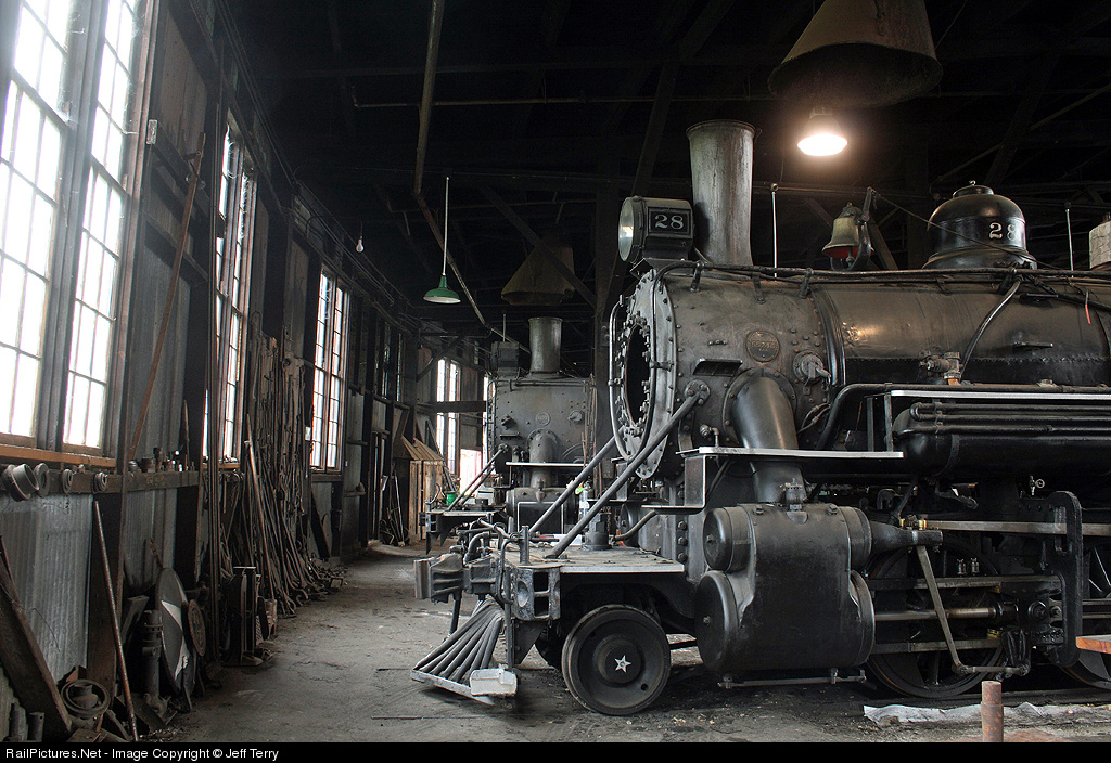2-8-0 28 and 2-8-2 34 stand silently in the Jamestown roundhouse.