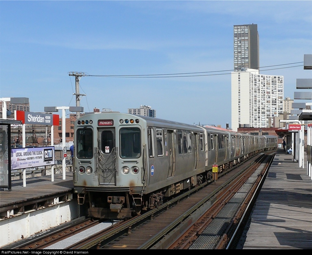 A Red Line train slows to a stop at Sheridan Road, a station sandwiched in between two 90 degree turns that date back to pre 1900 when this elevated was constructed. The right of way was shifting from one alongside an alley to run north alongside the Milwaukee steam railroad. This was orignally an express/local stop, one short of the end terminal at Wilson AV. Evanston Express trains...OOPS! Purple Line trains run express on the outside tracks today and the Red Line trains do local service. I have two other photos on the DB looking out at each end of this station.